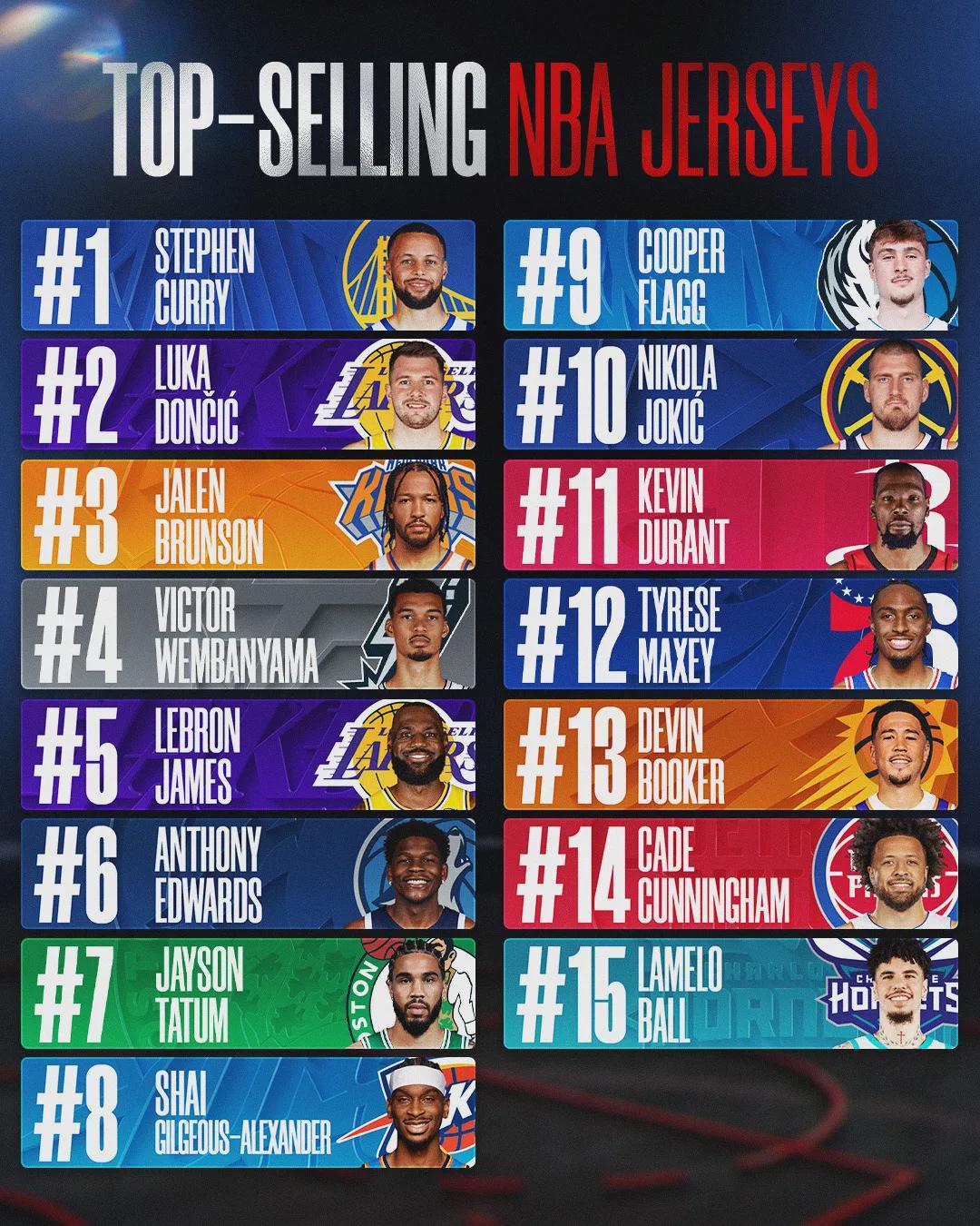 今天NBA官方晒出本赛季球衣销量,库里高居第一,东契奇位列第二,布伦森排名第三。塔图姆缺席大半个赛季,依然能排名第七,独行侠状元弗拉格排名第九。值得一提的是,榜单上的华子和坎宁安等人都失去了最佳阵容的评奖资格。