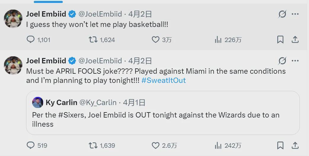 恩比德现在跟76人管理层矛盾重重,上赛季他想离队治疗膝伤,但球队不允许,恩比德直接找76人老板告状。今年4月2日,76人对阵奇才,赛前76人宣布恩比德因病缺阵。恩比德炮轰球队:“他们就是不想让我打球!我今晚要上场!”