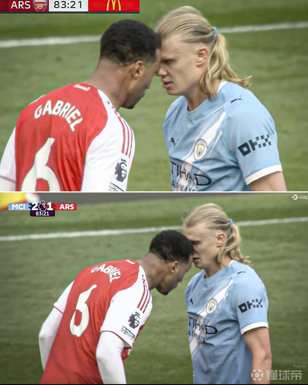 加布里埃尔与哈兰德,这两位分别代表阿森纳与曼城、以身体对抗见长的“角斗士”,在比赛第84分钟陷入缠斗,两人额头相抵。就在此时,这位巴西后卫突然做出冲动之举,用额头用力撞向了哈兰德的面部。