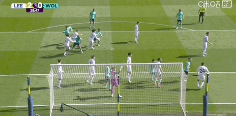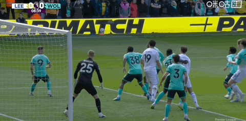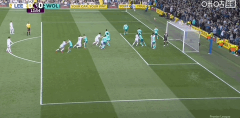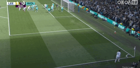 第13分钟,利兹联角球进攻罚到后点,勒温横传门前皮球贴着门线滑门而过